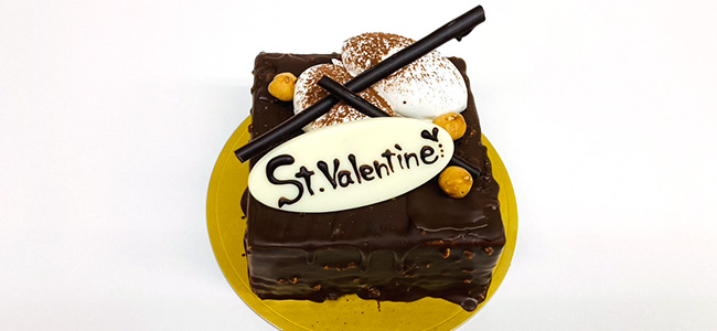 口溶けの良いヘーゲルナッツのプラリネクリームをコーヒー生地の上に乗せて、ナッツ入りのチョコレートでコーティングしたバレンタイン限定ケーキです。