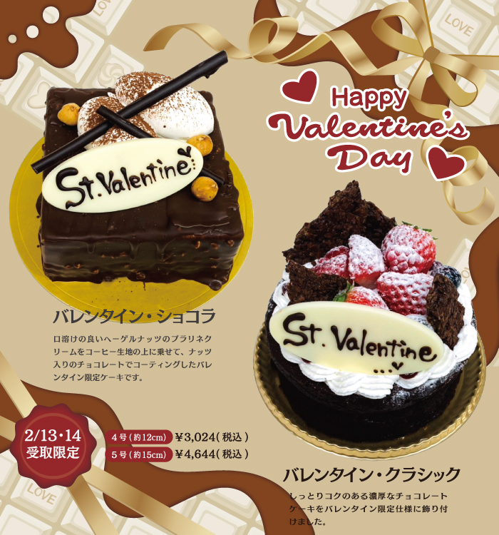 バレンタインケーキ バレンタイン・ショコラ、バレンタイン・クラシックの2種類のケーキをご用意しています。